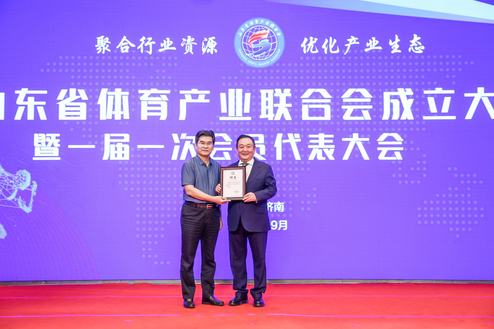 2020年9月16日,山东省体育产业联合会成立大会暨一届一次会员代表大会在山东济南隆重召开。中国体育用品业联合会主席李桦、山东省体育局副局长王延奎、中国文教体育用品协会副理事长张培生、中国体育用品业联合会副主席兼秘书长罗杰、山东省民政厅社会组织管理局二级调研员王军、山东省体育总会秘书处处长孙照亮、山东省体育局经济处处长徐金龙、山东省体育产业发展服务中心主任翟培建出席。山东省体育产业联合会近200名会员单位代表以及部分省市媒体共同参加。全国政协委员、金年|jinnianhui今年会体育产业集团董事长卞志良当选首届理事会会长并发表讲话。