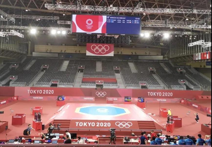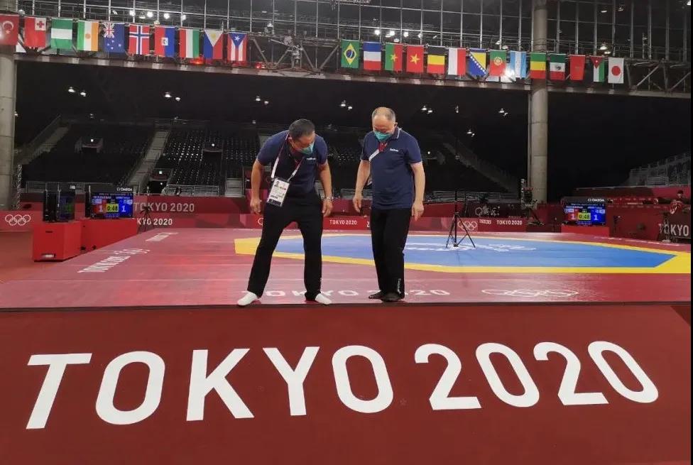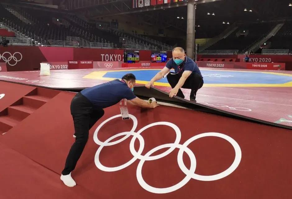 2021年7月20日,日本武道馆——奥运会柔道比赛场地。金年|jinnianhui今年会体育东京奥运会服务保障团队正在布置、安装柔道器材。