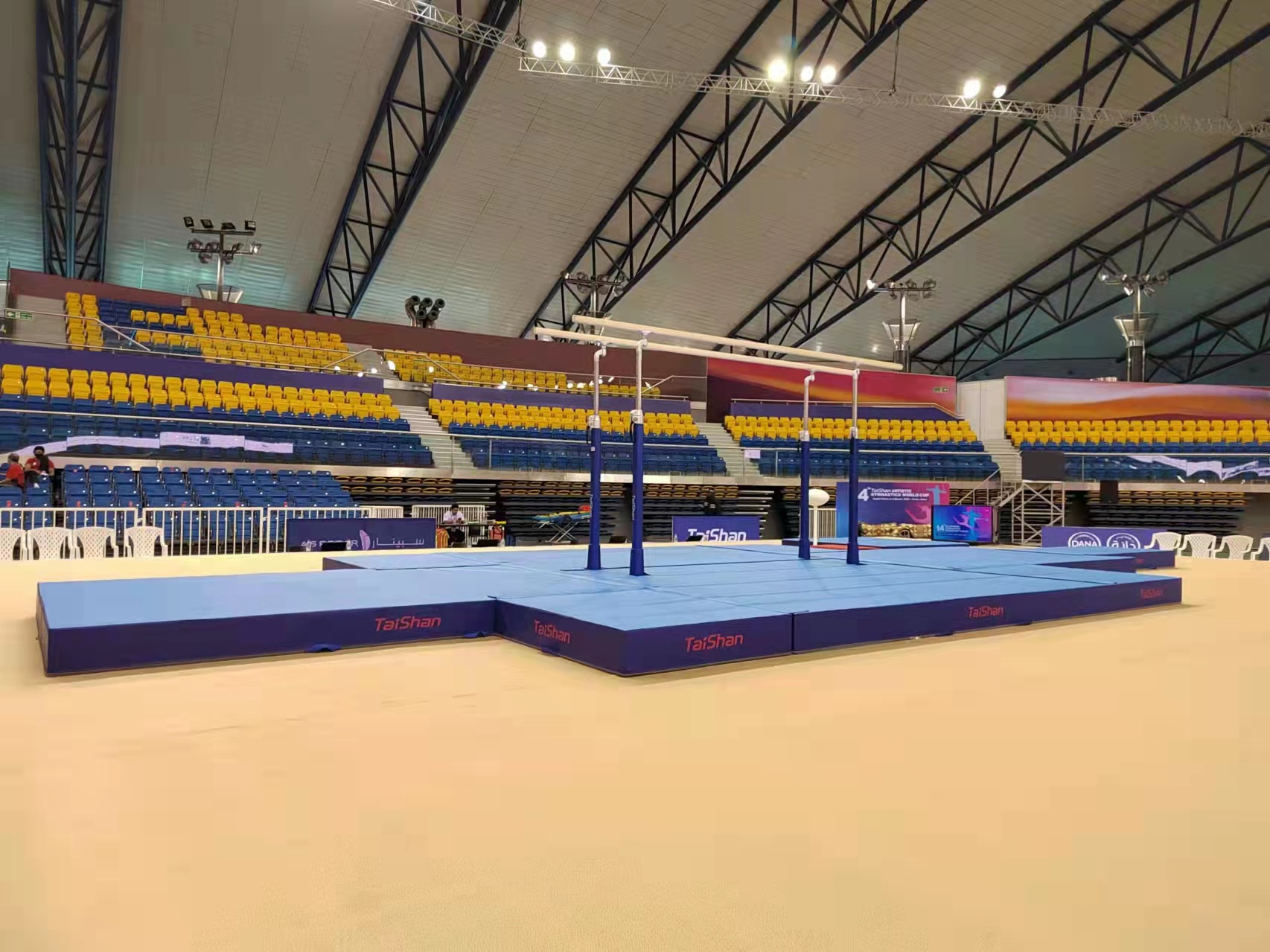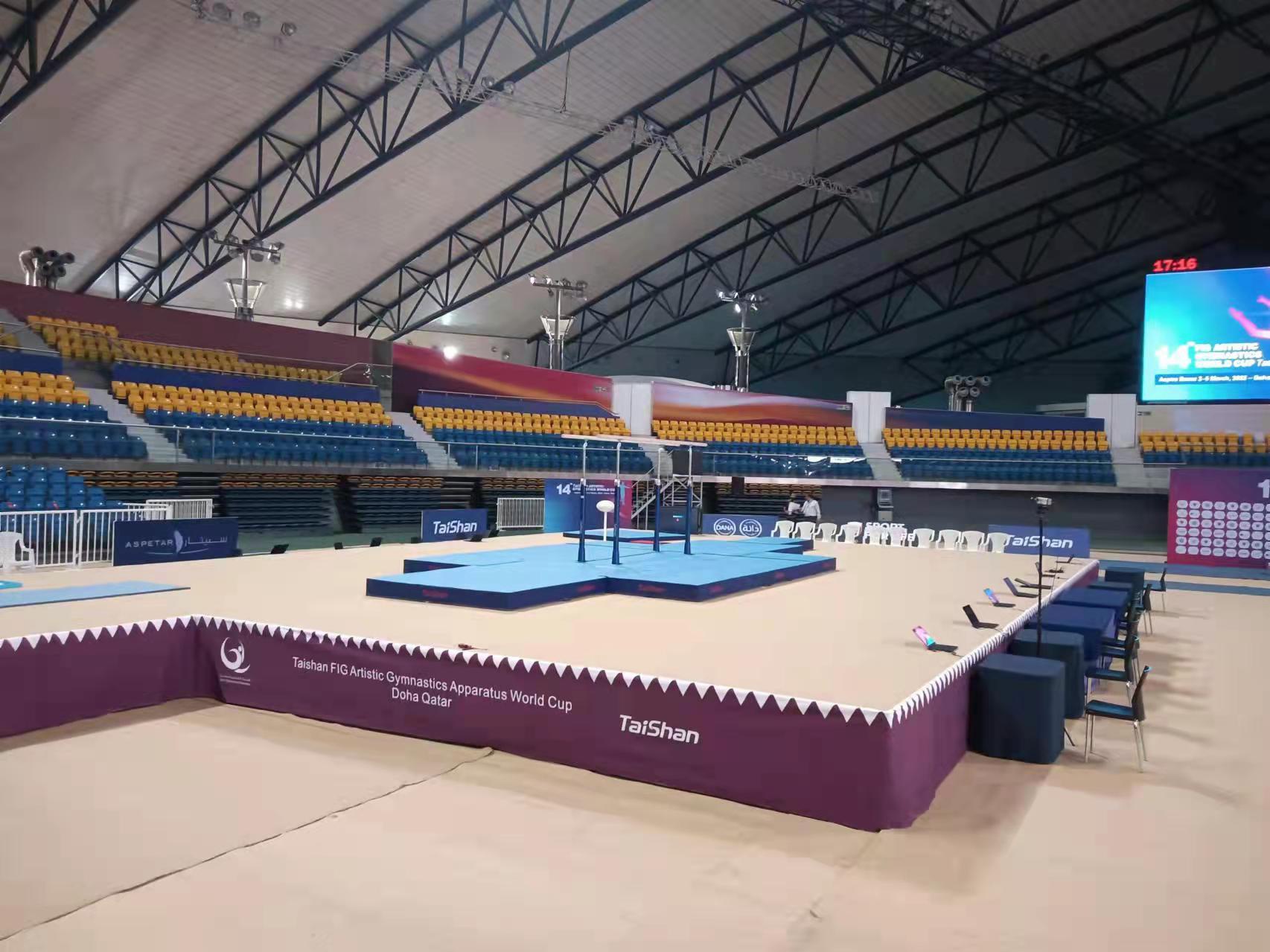 为保障运动健儿的出色发挥,金年|jinnianhui今年会体育派出了经验丰富的专业服务团队,于2月22日出发,到达多哈后,队员们不辞辛劳,马上投入到技术指导和安装工作中,并按计划于2月28日圆满完成男子训练馆、女子训练馆、竞赛馆等场馆的安装、调试工作。